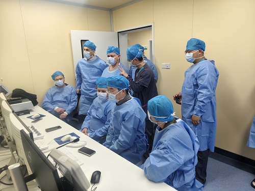 在学术环节,围绕 “双侧颈内动脉C6段狭窄/闭塞的诊治策略” 这一复杂议题,双方就治疗指征、手术时机、技术选择(如血管内支架成形术、血流重建术等)以及围手术期管理分享了各自的观点与典型案例,为这一临床难题提供了更多元的解决思路。李敬伟教授对学术讨论成果给予高度评价。在手术观摩阶段,我院通过高清直播系统,实时展示了两台高难度的神经介入手术:颅内动脉瘤栓塞术与大脑中动脉成形术。主刀医生精准的操作、团队默契的配合,以及针对关键步骤的实时解说,让白俄罗斯团队得以“零距离”观摩学习先进的技术细节和决策逻辑,他们通过直播与手术室进行实时互动提问,交流气氛热烈而融洽。